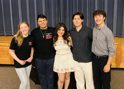 Members of last year's cast who volunteered as mentors to the students at Gallaher Elementary School in their 2025 production of The Music Man, Jr. (From left to right: Jessi Grudzinski, Carson Casale, Adriana Roldan-Roman, Alex Aguilar, Tristan Negley)